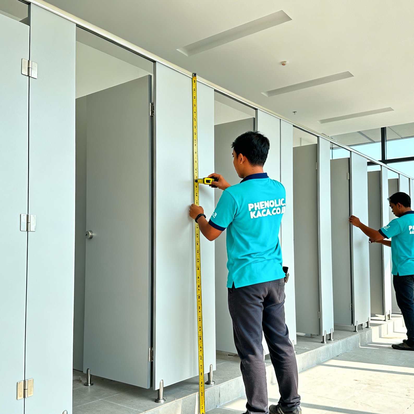 Langkah pertama adalah melakukan survey lapangan untuk mengetahui kondisi ruangan, ukuran area toilet, serta posisi pipa dan dinding. Dari hasil pengukuran ini, tim menentukan jumlah bilik, ukuran tiap cubicle, dan tata letak panel agar hasilnya presisi.